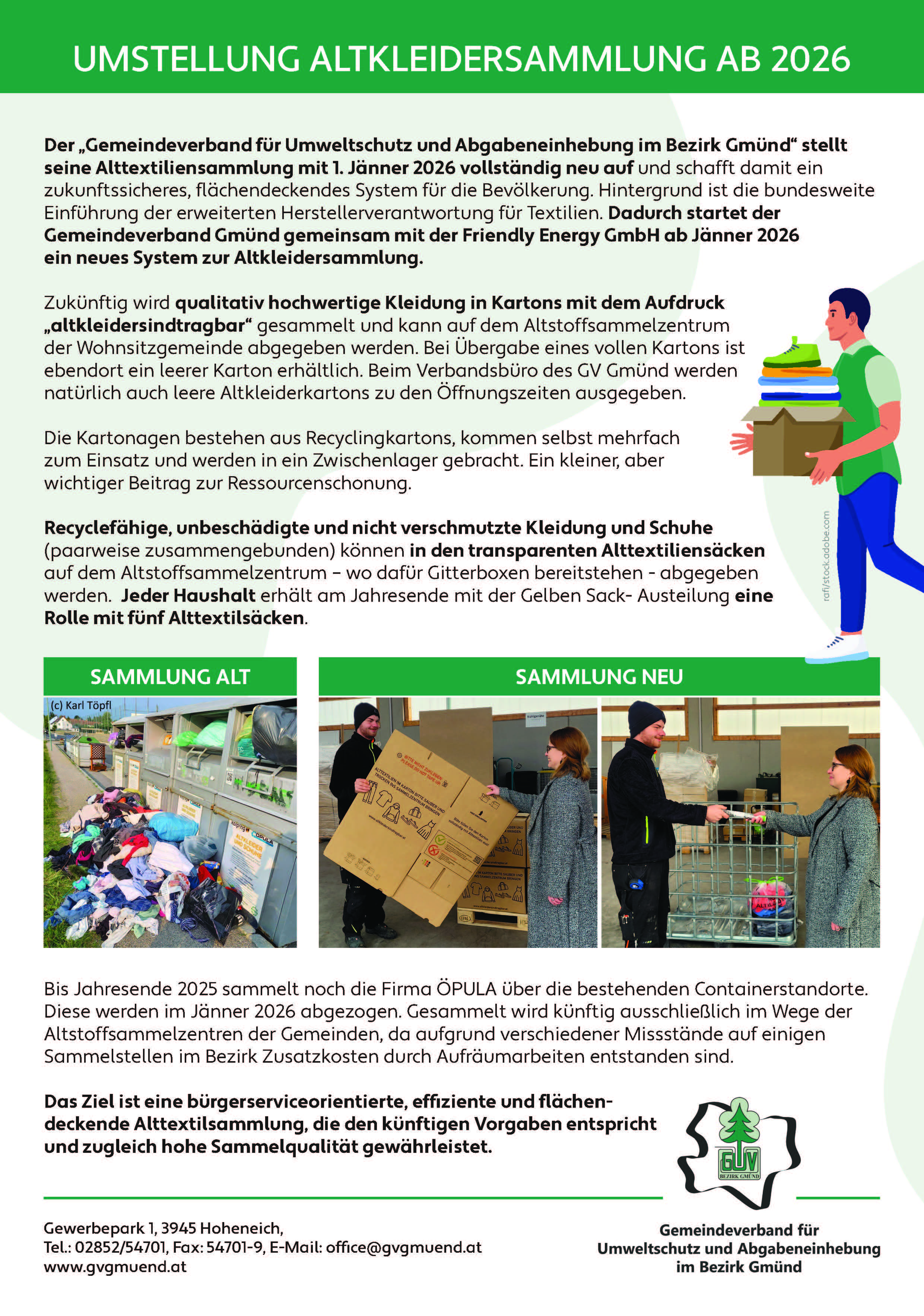 Der „Gemeindeverband für Umweltschutz und Abgabeneinhebung im Bezirk Gmünd“ stellt seine Alttextiliensammlung mit 1. Jänner 2026 vollständig neu auf und schafft damit ein zukunftssicheres, flächendeckendes System für die Bevölkerung. Hintergrund ist die bundesweite Einführung der erweiterten Herstellerverantwortung für Textilien. Dadurch startet der Gemeindeverband Gmünd gemeinsam mit der Friendly Energy GmbH ab Jänner 2026 ein neues System zur Altkleidersammlung.