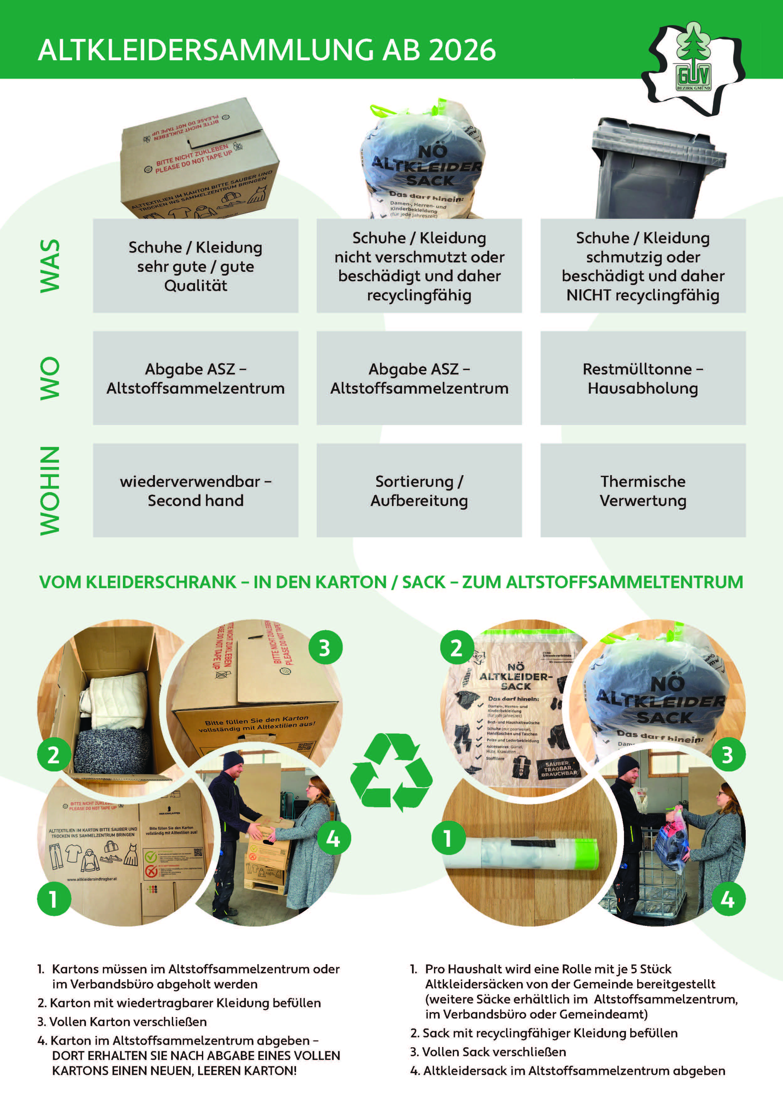 Zukünftig wird qualitativ hochwertige Kleidung in Kartons mit dem Aufdruck „altkleidersindtragbar“ gesammelt und kann auf dem Altstoffsammelzentrum der Wohnsitzgemeinde abgegeben werden. Bei Übergabe eines vollen Kartons ist ebendort ein leerer Karton erhältlich. Beim Verbandsbüro des GV Gmünd werden natürlich auch leere Altkleiderkartons zu den Öffnungszeiten ausgegeben.
